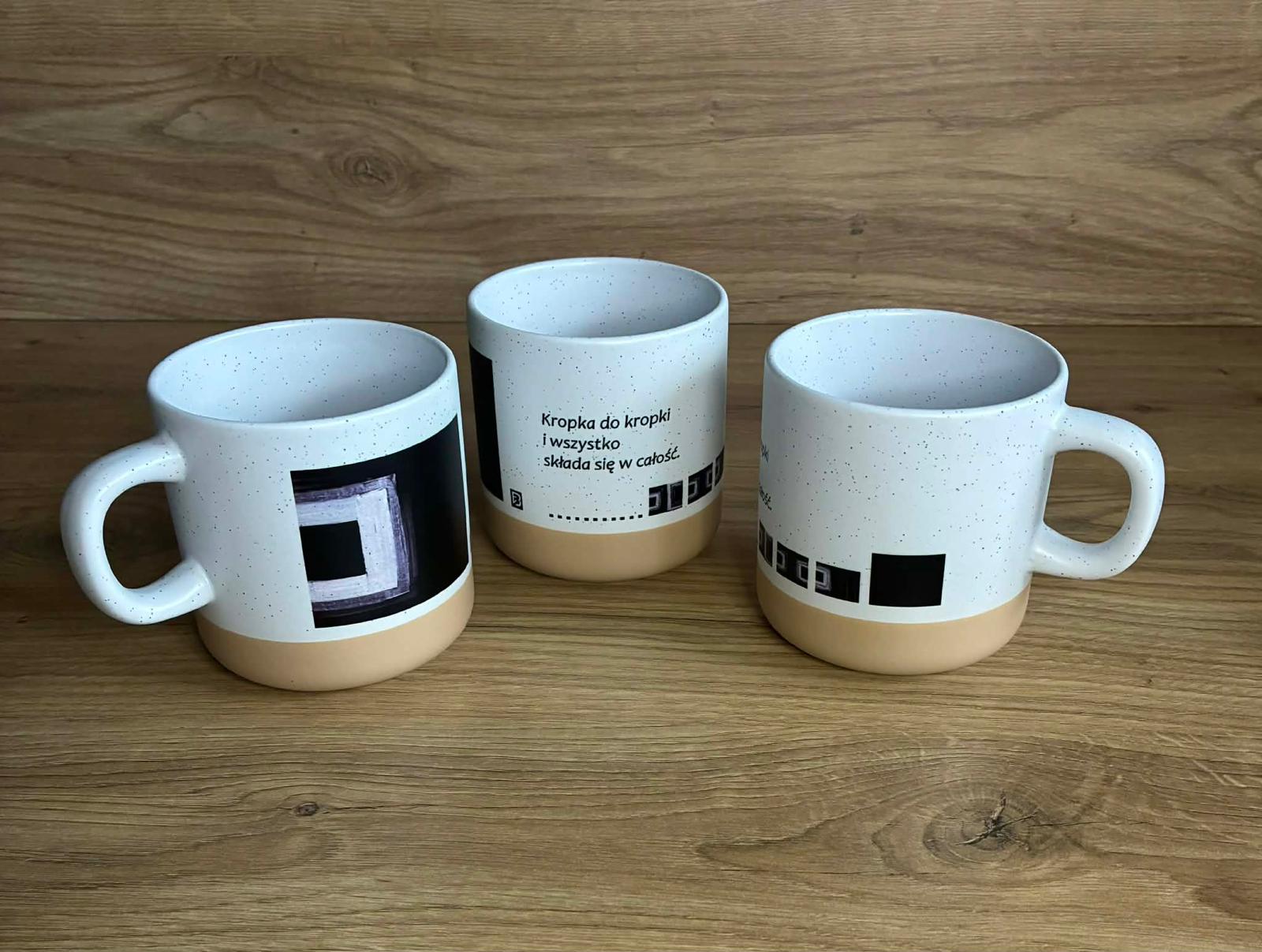Ceramiczny kubek TERRA (330 ml) w białym, nakrapianym kolorze — z autorską grafiką „Kwadraty” i tekstem Black Format & Words. Minimalistyczny, wyrazisty, idealny do kawy, herbaty i na prezent.